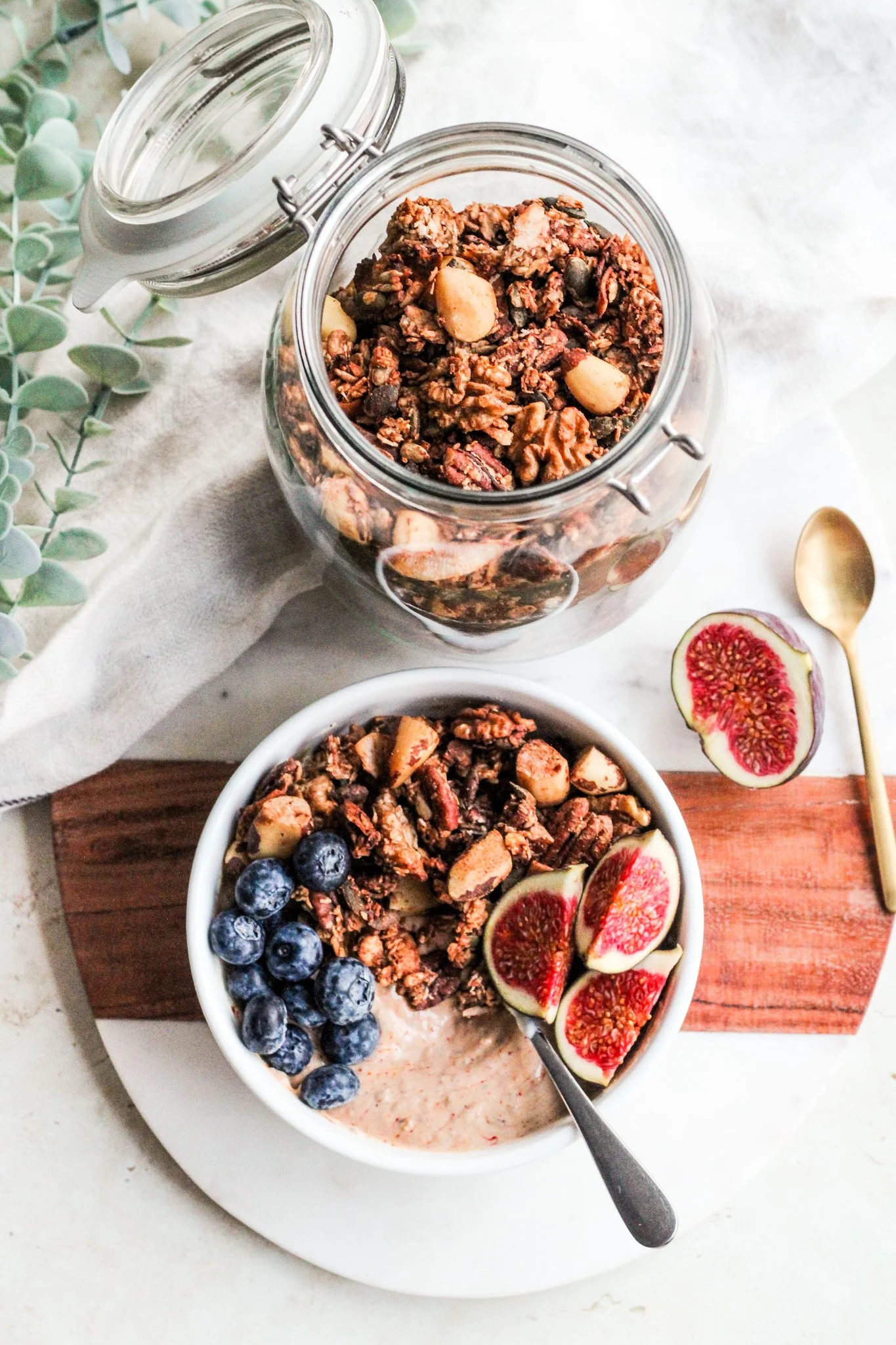 And it really is so simple to make a batch of delicious granola! I love to mix and match the ingredients, nuts and seeds, flavours and even add in additional dark chocolate or cacao nibs!